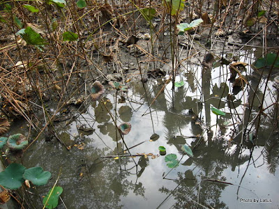 掉落的蓮蓬裡沒有種子表示可能被採收或已自然掉落,那麼明年將會有新的荷葉荷花加入